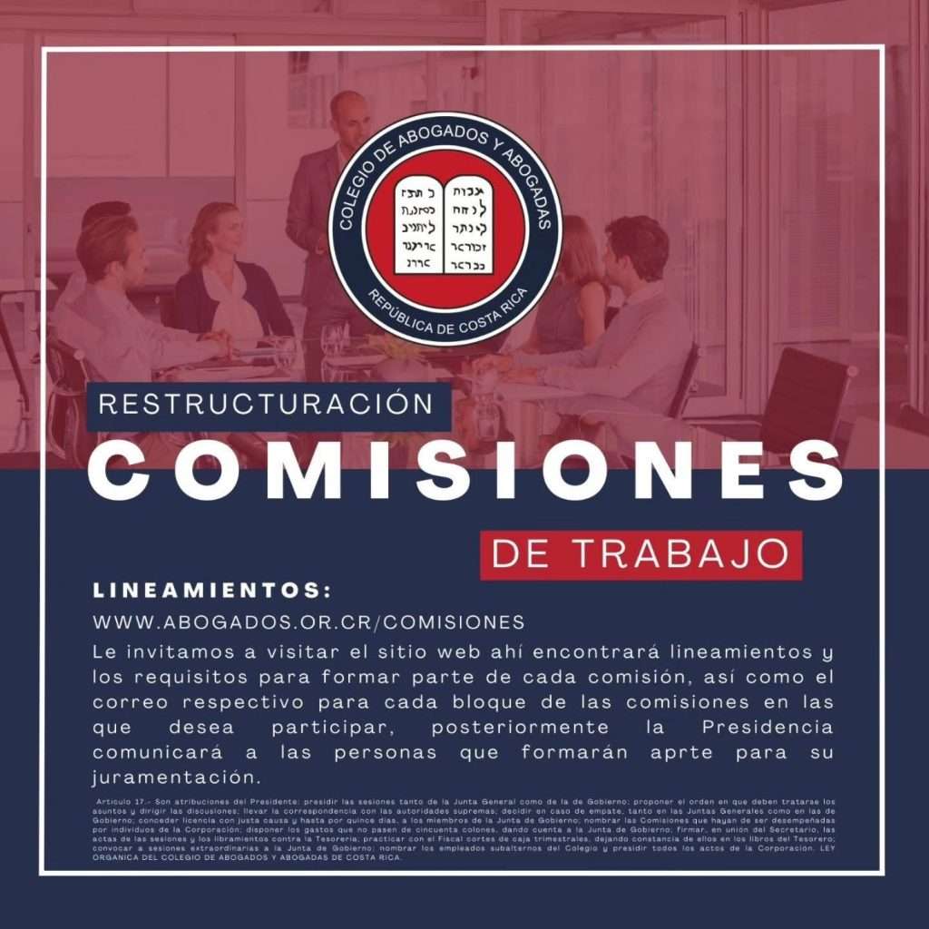 El Colegio de Abogados y Abogadas de Costa Rica invita a todas las personas agremiadas a visitar el sitio oficial de Comisiones: www.abogados.or.cr/comisiones