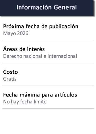 Únicamente, se recibirán trabajos de investigación, comunicación científica, estudios de casos legales, informes técnico-legales, perspectiva sobre un tema actual (debidamente fundada), propuestas de proyectos de Ley, así como memorias, síntesis o resumen de eventos de Derecho llevados a cabo en el cuatrimestre anterior al que se desea publicar.