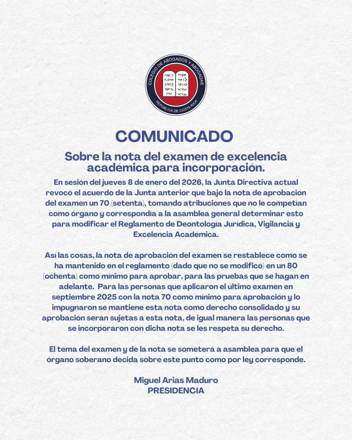 En sesión del jueves 8 de enero de 2026, la Junta Directiva actual revocó el acuerdo adoptado por la Junta Directiva anterior que había reducido la nota de aprobación del Examen de Excelencia Académica a 70 (setenta), al haberse adoptado dicho acuerdo sin competencia para ello, pues cualquier modificación al Reglamento de Deontología Jurídica, Vigilancia y Excelencia Académica corresponde exclusivamente a la Asamblea General, como órgano soberano.